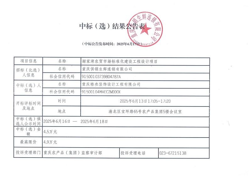 謝家灣農貿市場室內裝飾工程項目 中標結果公告表